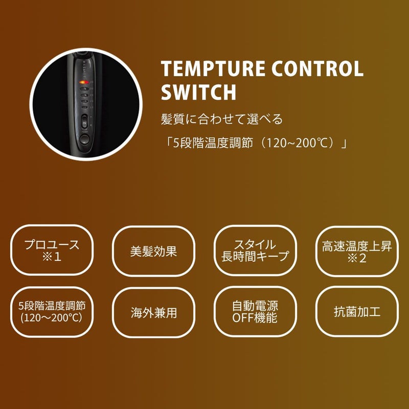120℃~200℃まで10℃毎の5段階温度調節が可能なので、髪質に合わせた最適な温度でスタイリング可能。
