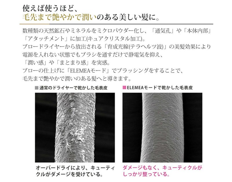 低温の「EREMEAモード」で、オーバードライによるキューティクルの損傷やタンパク変性を防ぎ、健やかな美髪に。