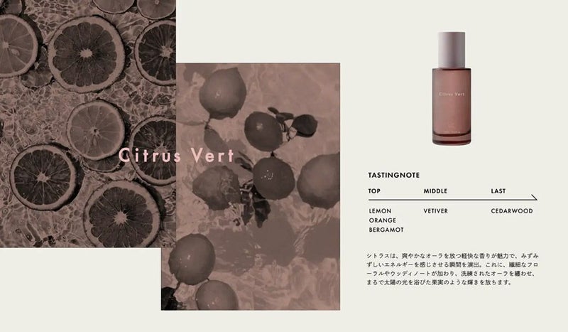 ・Citrus Vert(シトラスベール):爽やかなオーラを放つ軽快な香りで、みずみずしいエネルギーを感じさせる瞬間を演出。