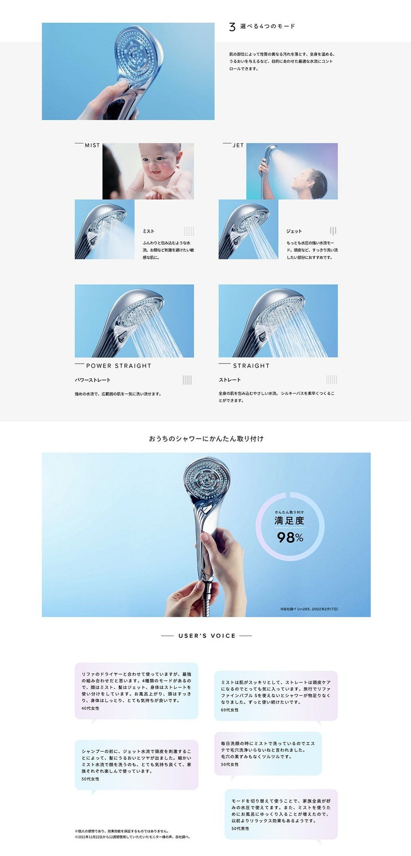 肌に負担をかけない細やかな水流コントロールでやさしく落とし、心地よく温め、うるおいを与える。
