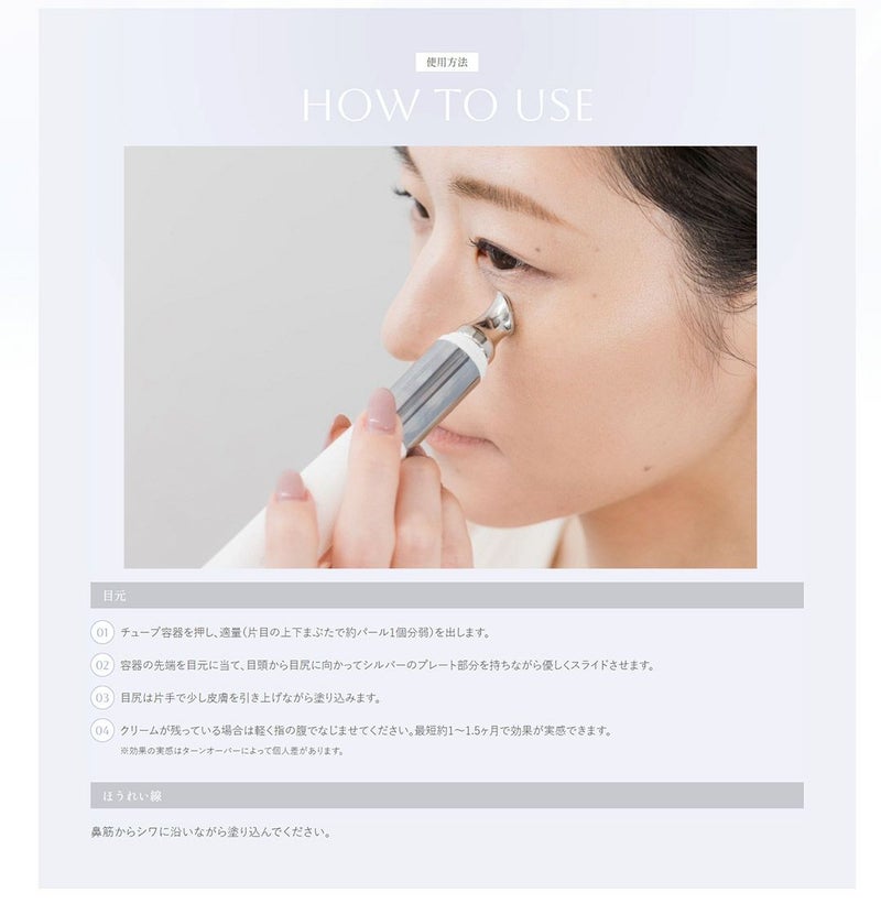 医薬部外品として美白※シワ改善の効果が認められている話題の「ナイアシンアミド」を有効成分として配合した目元専用クリーム。 目元をはじめ、ほうれい線などお肌の気になる部分に継続的に塗り込むことでシワの改善効果、しみ・そばかすの予防、保湿、肌荒れの防止に効果的です。容器先端には美顔器を内蔵し、美容成分を角質層まで浸透させます。
