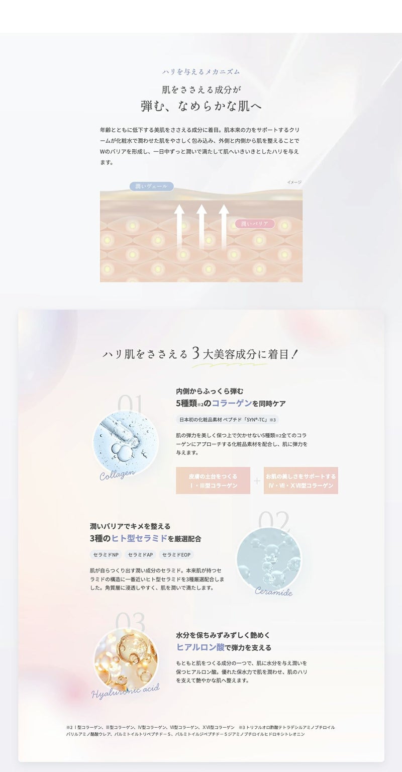 美肌に欠かせない「コラーゲン」「セラミド」「ヒアルロン酸」といった、本来の肌が持つ成分に着目し、肌にいきいきとしたハリを与える土台ケア※クリーム。