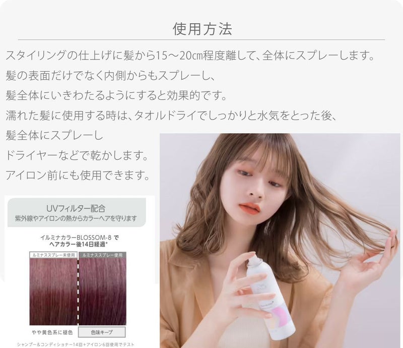 髪全体にスプレーしドライヤーなどで乾かします。アイロン前にも使用できます。