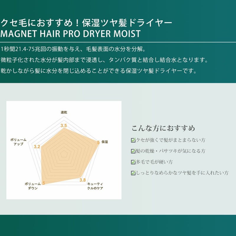 1秒間21.4-75兆回の振動を与え、毛髪表面の水分を分解。 微粒子化された水分が髪内部まで浸透し、タンパク質と結合し結合水となります。 乾かしながら髪に水分を閉じ込めることができる保湿ツヤ髪ドライヤーです。